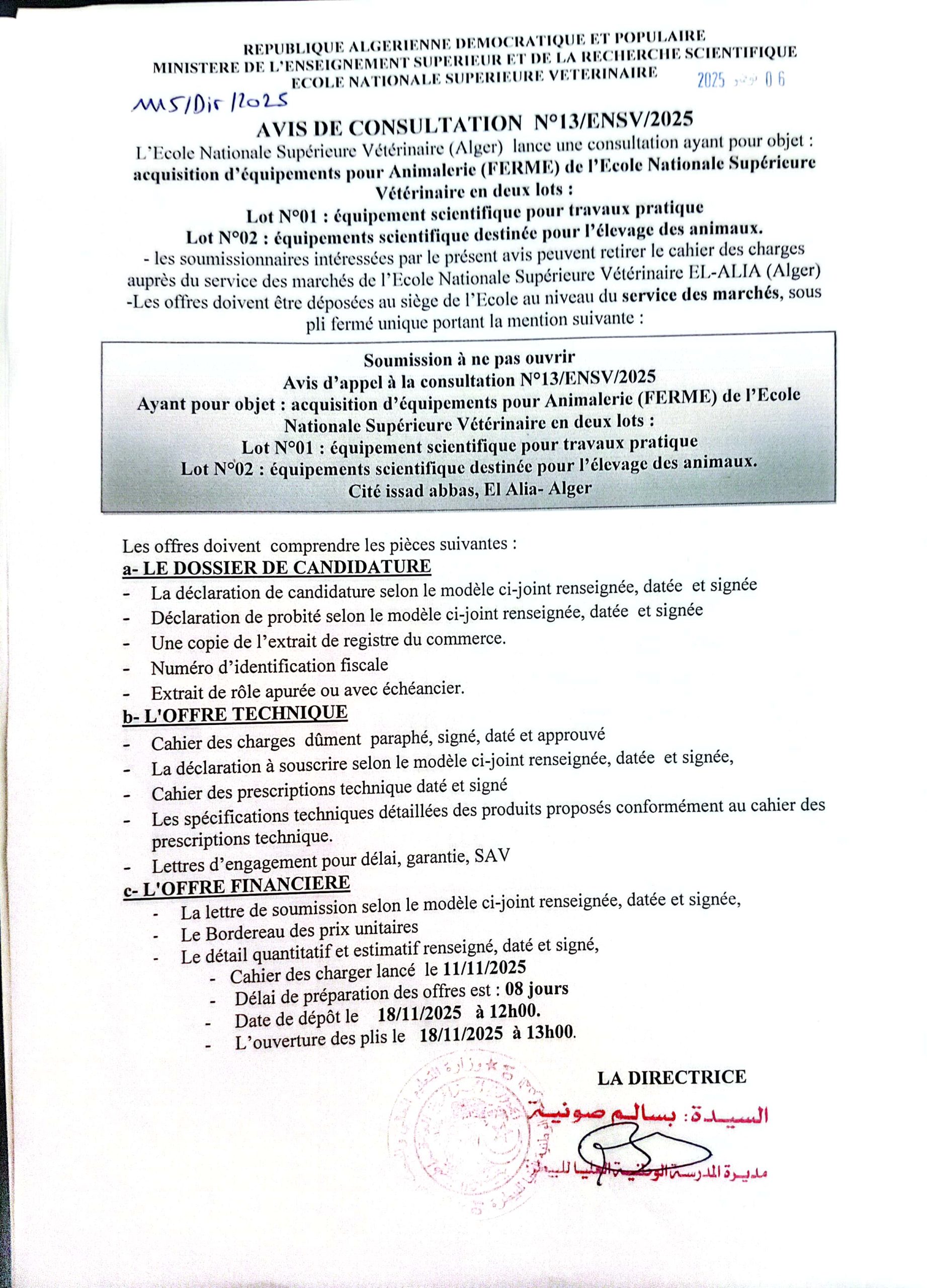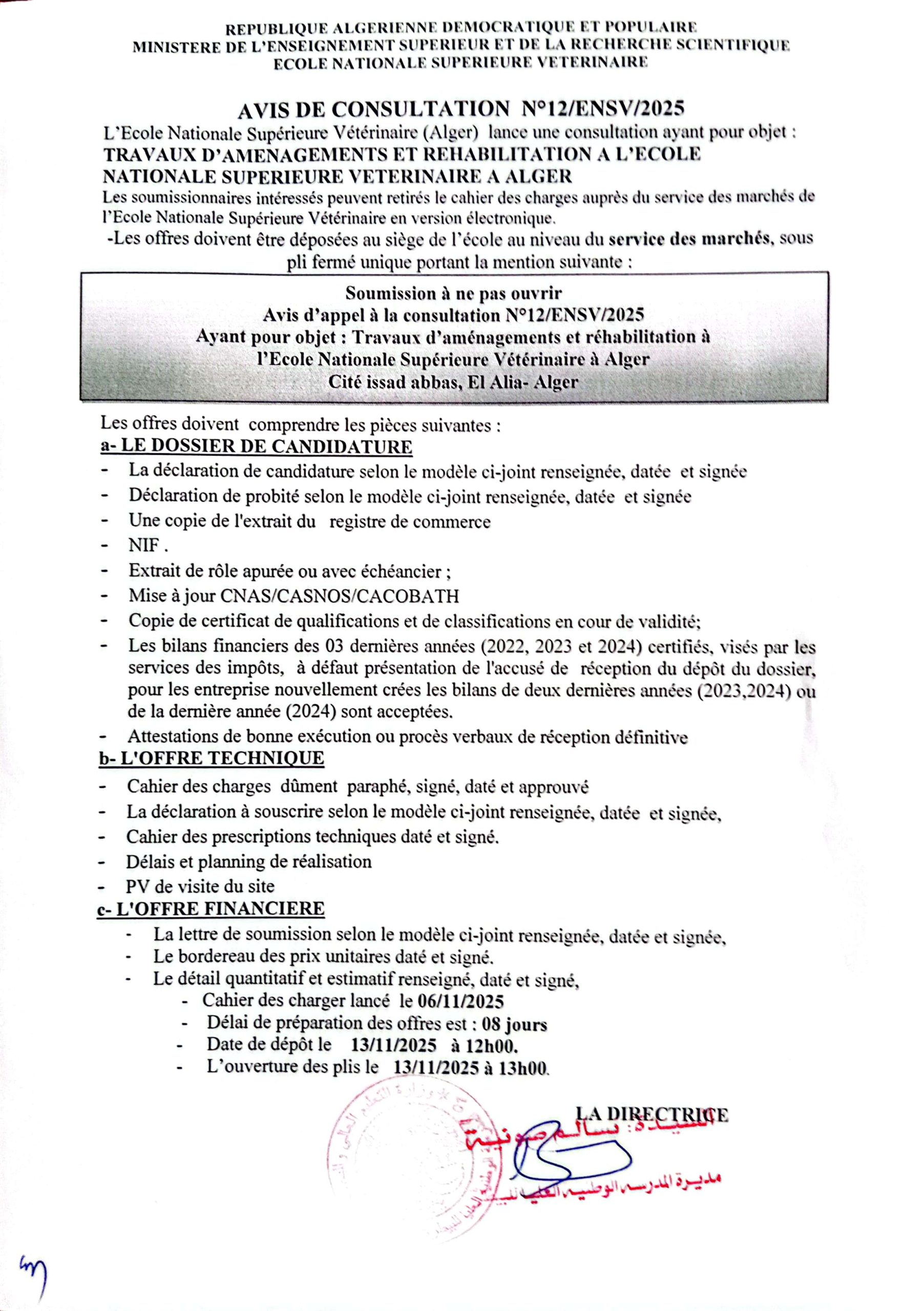 Avis d’infructuosité de la Consultation N°11/ENSV/S.G/S.M/2025