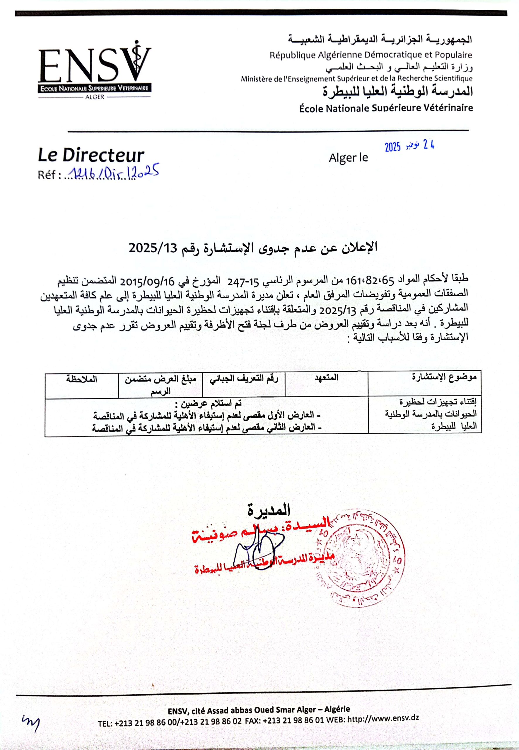 Avis d’infructuosité de la Consultation N°11/ENSV/S.G/S.M/2025