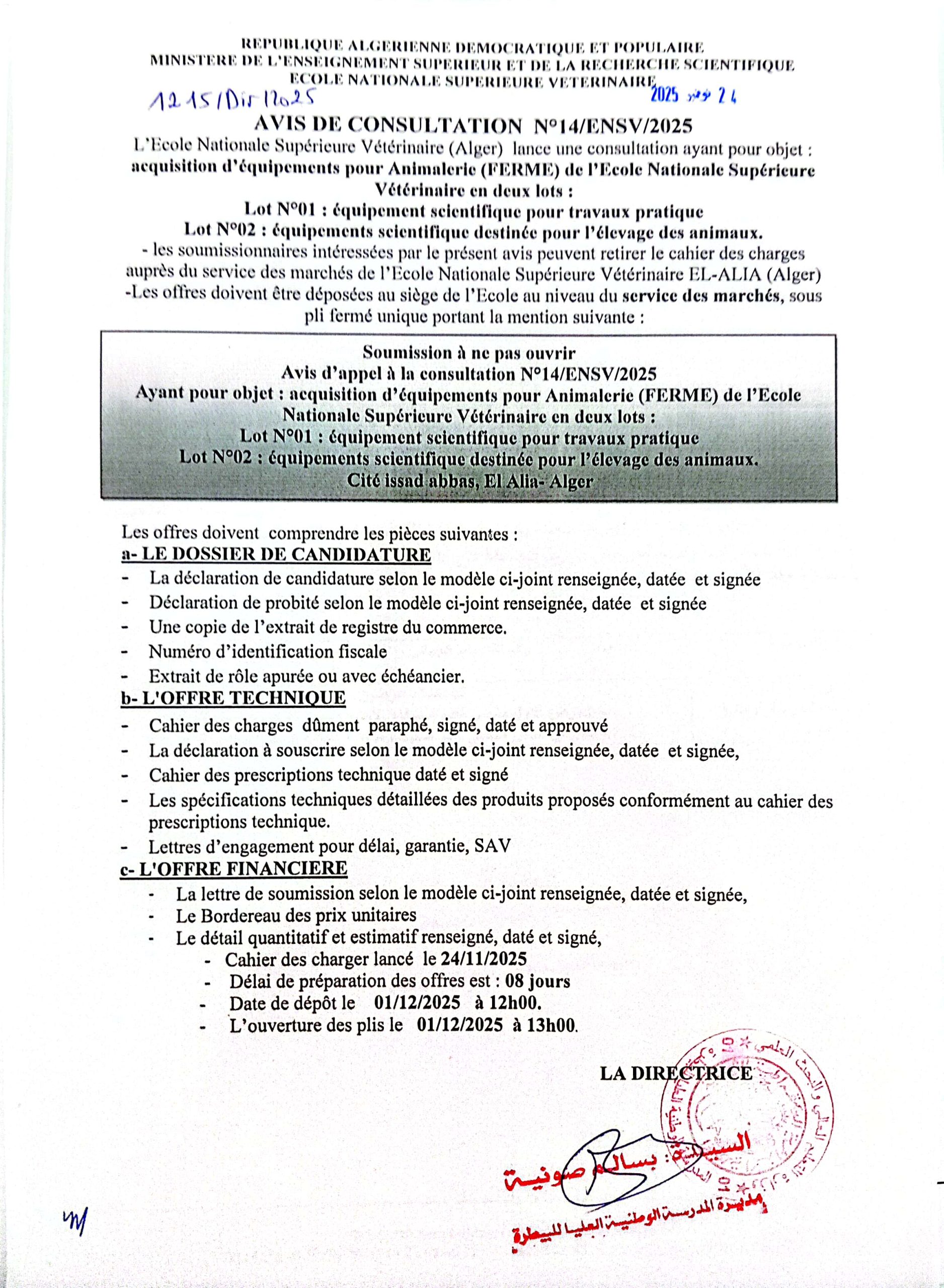 Avis de consultation N°15/ ENSV/S.G|S.M/2025
